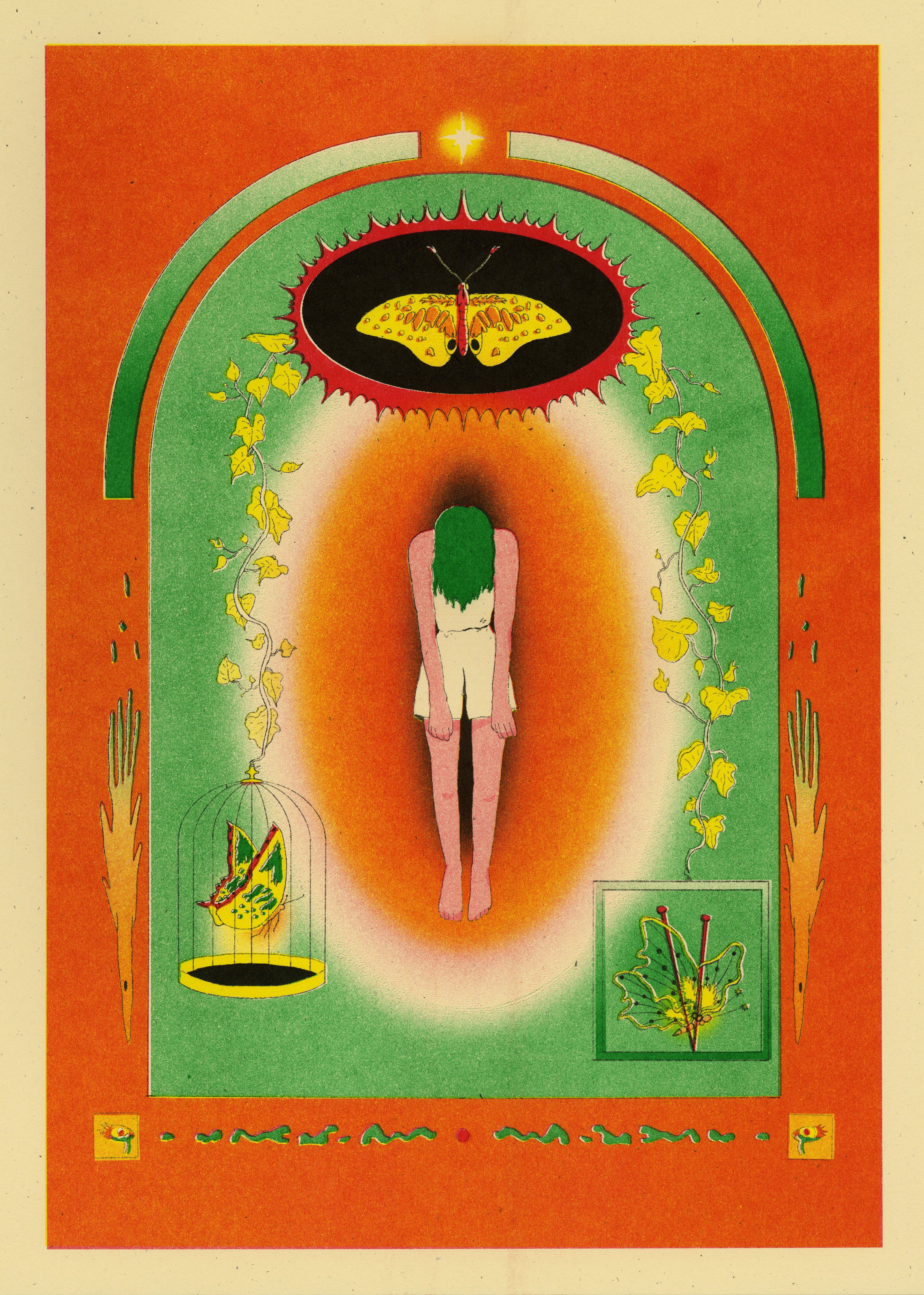 A Nightmare That Never Ends is a series about the complex struggle and emotions one goes through when one chooses to leave their home country and settle down in a strange environment. In the series, the artist viewed the process as being reborn into a life that is destined to embody conflict and identity crisis. The rebirth seems to be a dream, but it ends up a nightmare. The artist used symbols and abstract comic language to communicate the complexity of the emotions felt through this journey.